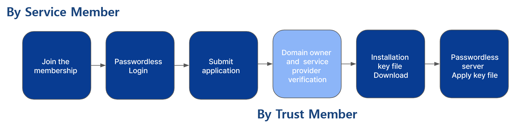 - Para que una empresa que opera un servicio en línea utilice un servidor Passwordless X.1280, debe registrarse como miembro de servicio de la Passwordless Alliance y presentar una solicitud de servicio sin contraseña. Se emitirá una clave de licencia después de que su solicitud de servicio sin contraseña haya sido verificada por un miembro local de confianza. La clave puede activarse registrándola en el servidor Passwordless X1280.